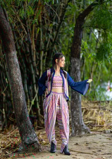 A bold fusion of ethnic and modern—dhoti pants, printed tube top & denim shrug.