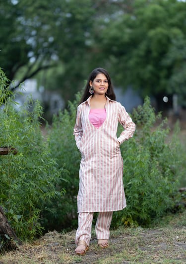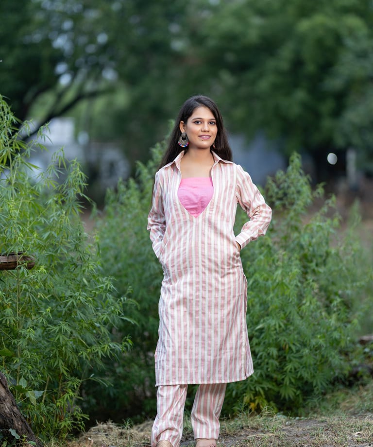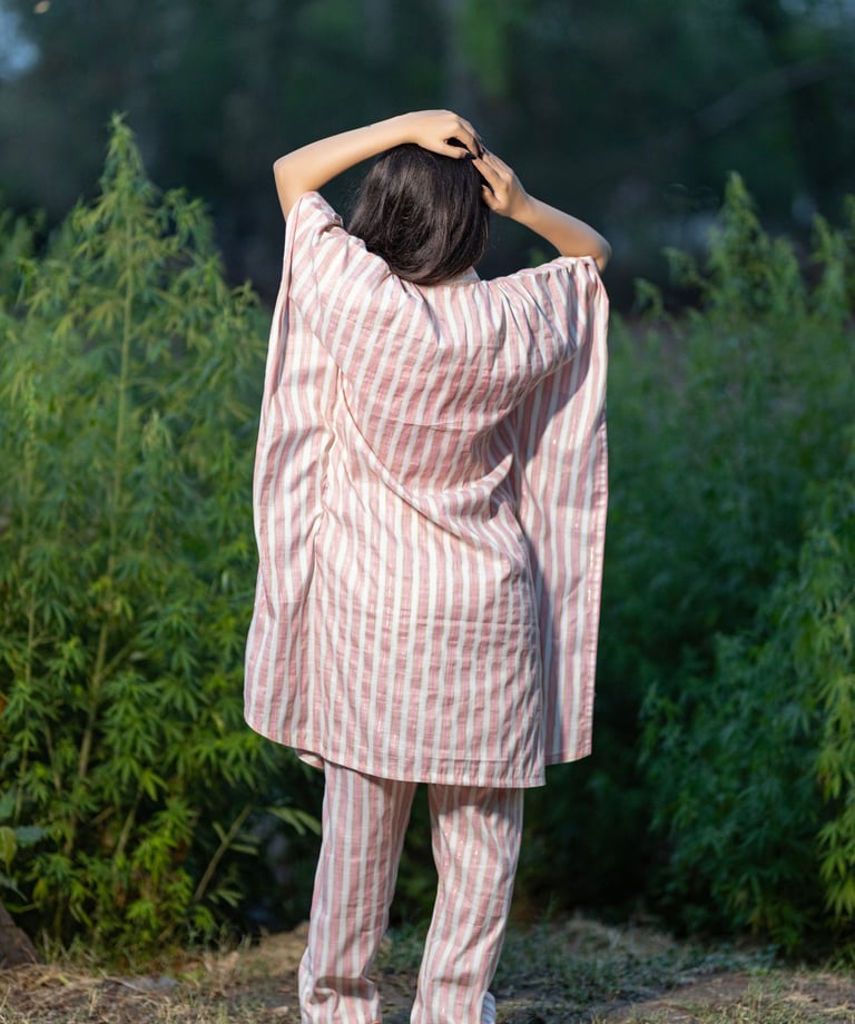 Relaxed kaftan style meets modern co-ord elegance in soft blush stripes.